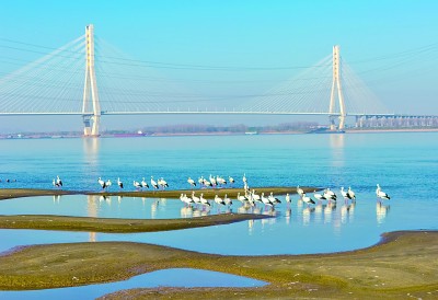 长江安徽省池州市贵池段,拥有众多鱼虾丰富的浅水区域,是长江中下游候鸟迁徙的重要节点,吸引了包括东方白鹳、小天鹅、豆雁在内的十多种候鸟来此越冬。图为日前,在贵池段的天然沙洲上,国家一级保护动物东方白鹳在栖息、觅食。饶治国摄/光明图片
