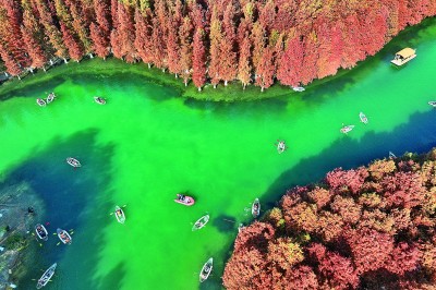 12月6日,游客在江苏常州新龙生态林的水上森林区域划船观景。 新华社发