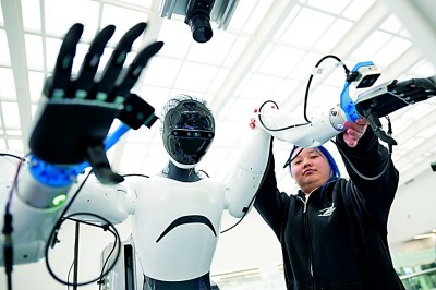 在湖北人形机器人创新中心,工作人员对人形机器人进行调试作业。新华社发