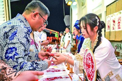 12月9日,989编队在长白山舰举行甲板招待会,华侨华人体验剪纸文化。新华社发