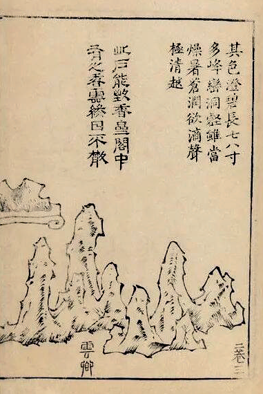林有麟自云“检阅古今图籍”,凡“奇峰怪石有会于心者,辄写其形,题咏缀后”,书中所录,限于“小巧足供娱玩”者。该书使后人可直观领略苏轼雪浪石、米芾研山等名石的神韵。同时还对石头的用途,如叠制假山或池石盆景作了描述。