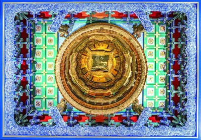 在更细微的层面,藻井还折射出古人对于宇宙的情感。它不是冷峻抽象的几何图式,而是被云龙、莲瓣、海水江崖等纹样填满的“有人情的天空”。盘旋的龙纹,寓意帝王承天受命;舒卷的莲瓣,象征净土与清明;翻涌的水浪,则指向永续不息的生命之流。人们在这样的穹顶之下生活、朝会、祭祀,久而久之,宇宙仿佛成为可以被抬头看见的存在。