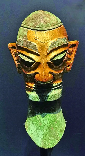 三星堆遗址出土的金面具青铜人头像 本报记者李韵摄/光明图片