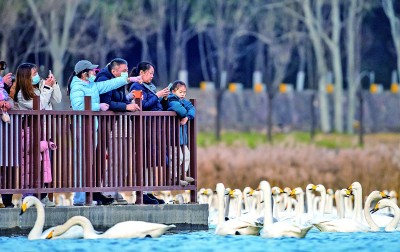 进入冬季,大批白天鹅来到河南省三门峡市黄河湿地栖息越冬。近年来,随着当地不断加强黄河沿岸湿地生态保护工作,白天鹅的数量逐年增加。目前,三门峡黄河岸边40余万亩浅滩湿地已迎来万余只白天鹅。图为12月20日,游客在三门峡市天鹅湖国家城市湿地公园观赏白天鹅。新华社发