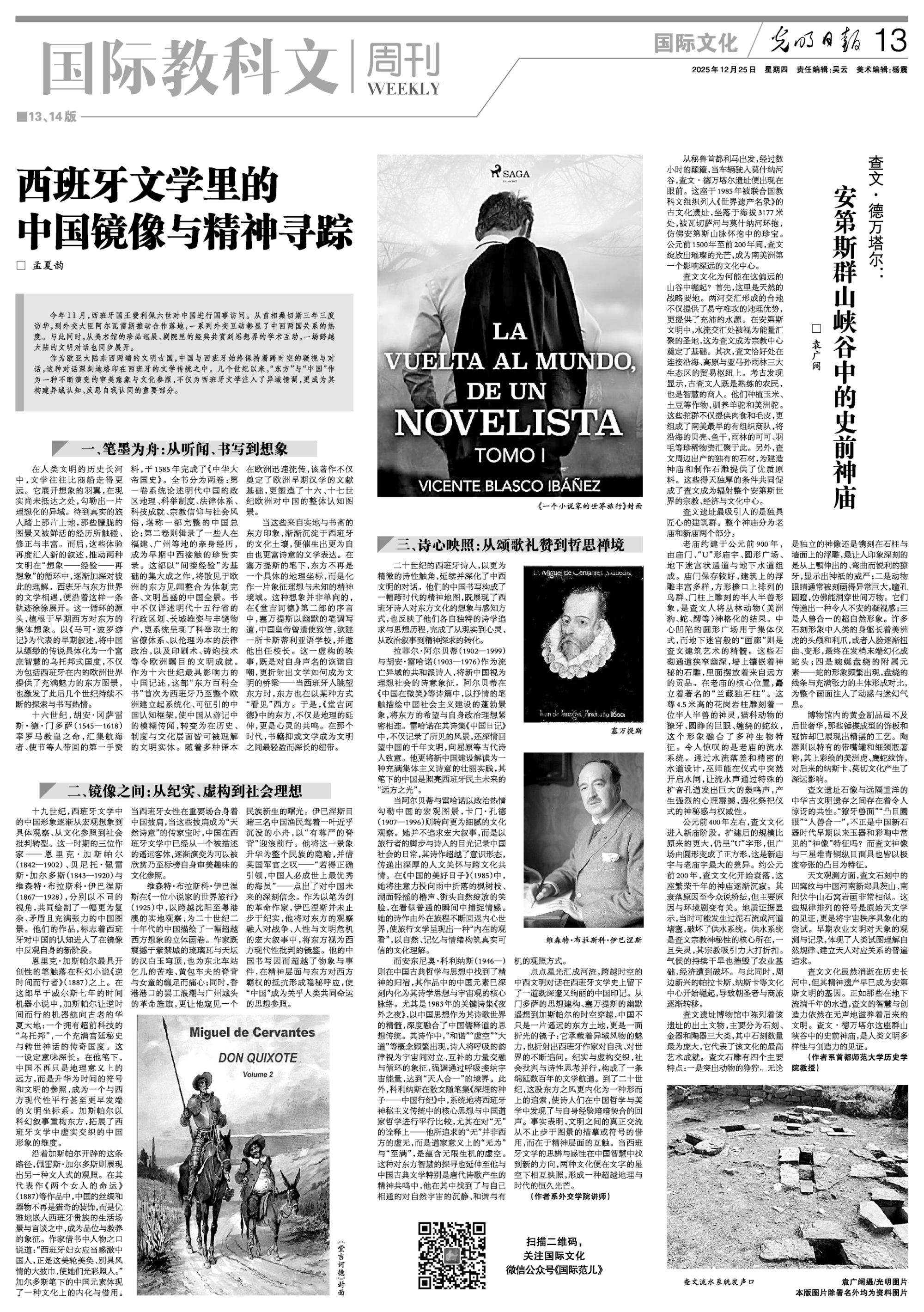 点点星光汇成河流,跨越时空的中西文明对话在西班牙文学史上留下了一道既深邃又绚丽的中国印记。从门多萨的思想建构、塞万提斯的幽默遥想到加斯帕尔的时空穿越,中国不只是一片遥远的东方土地,更是一面折光的镜子:它承载着异域风物的魅力,也折射出西班牙作家对自我、对世界的不断追问。纪实与虚构交织,社会批判与诗性思考并行,构成了一条绵延数百年的文学航道。到了二十世纪,这股东方之风更内化为一种形而上的追索,使诗人们在中国哲学与美学中发现了与自身经验暗暗契合的回声。事实表明,文明之间的真正交流从不止步于图景的描摹或符号的借用,而在于精神层面的互触。当西班牙文学的思辨与感性在中国智慧中找到新的方向,两种文化便在文字的星空下相互映照,形成一种超越地理与时代的恒久光芒。