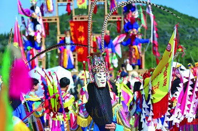 地戏主要盛行于屯堡村寨,同时也辐射影响到周边的布依族、仡佬族和苗族村寨,以其古拙粗犷的艺术风格和深邃多元的文化内涵,深受屯堡人喜爱。清道光年间的《安平县志》记载:“元宵遍张鼓乐,灯火爆竹,扮演故事,有龙灯、狮子灯、花灯、地戏之乐。”同为军屯移民,喇叭苗人村寨就不盛行地戏,只有庆坛傩仪,其唱跳仪式,尤其“戴脸子”等环节与屯堡地戏有相似之处,但并没有发展成系统而成熟的民间戏曲形式。这就证明地戏并不是发展成型之后才由移民带到贵州的。移民应该只带来了家乡的祭祀方式和娱乐习俗,这些民俗进入贵州落地生根,历经岁月洗礼,经过一代代屯军后裔不断地传承、发展和创新,最终形成现在的艺术形式。