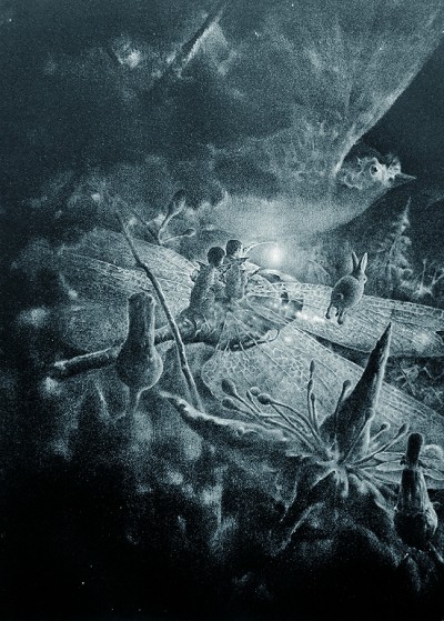 石版画《夜潜行》的创作正是以记忆中的那片树林为灵感,并融合了我的青春记忆与浪漫幻想。该作品以超现实的表现手法,描绘了一对恋人骑着蜻蜓座驾,与巨大的鸟儿、跳跃的野兔为伴,遨游于充满梦幻色彩的树林中。石版细腻的颗粒质感为画面带来朦胧的视觉感受,黑白灰的柔和过渡则为这林中奇景增添了几分神秘感。每每驻足画前,都让我想起一个青涩少年对未知远方的向往,以及身处暗夜仍努力寻光的倔强。这些美好而难忘的生命故事,皆是支撑我绘画创作的重要力量与不竭源泉。