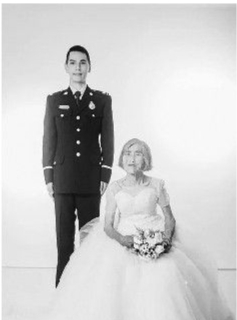 唐才英曾和邻居说,一辈子没有穿过婚纱。张佳港记在心里,决定帮外婆实现这个心愿。2020年5月,他悄悄张罗着给外公外婆拍婚纱照,但当时外公身体不好,于是张佳港穿上制服,替外公跟外婆拍了一组艺术婚纱照。当不知情的唐才英被张佳港带到影楼,还有点不好意思,但穿上婚纱的那一刻,唐才英的脸上羞涩中分明带着向往。