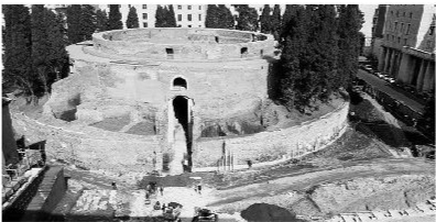 奥古斯都建立了罗马帝国,在位长达40年。奥古斯都陵墓建于公元前28至公元前23年,位于台伯河边。其圆柱形基座直径90米,上面种植了大量柏树。在最高处,矗立着一尊奥古斯都铜像,整个建筑的总高度达45米。陵墓的中心部分以白色大理石和石灰华装饰,是保存奥古斯都和他妻子利维娅骨灰的地方,四周的房间则用于存放皇室成员的骨灰。但多年来,这座陵墓一直处于废弃状态,满目荒凉,杂草丛生,以至于现代罗马人把它形容为一颗“烂牙”。