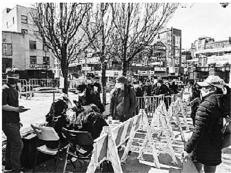 我翻译给老太太听,老太太一脸忧虑。“其他地点,那在哪里呢?”拉丁美洲裔女孩把手机屏幕拿给老奶奶看——其实就在离这里一站地铁的花旗球场,下周就有好多空位。然而老太太拼命摇头,“我不知道怎么坐过去啊!”“那要不……你帮这位老太太问问他?”拉美裔女孩对我说,指向旁边一个男子,“他组织了一个车队,有很多志愿者司机可以接送老人。”