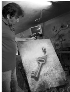 盖斯的画作中有许多蕴含“回家”的主题。在他逼仄幽暗的画室里有这样一幅画:一位戴着巴勒斯坦传统头巾的长者,拄着拐杖,身后拖着巨大的钥匙,步履维艰,但仍执着前行在归家路上。他说,被迫离开家园的巴勒斯坦难民手中仍然留存着家门的钥匙,这是他们要回到祖国的信念。尽管经过几十年,大多数人的家园早已被占领,房屋或已不复存在,尽管回家的代价可能非常沉重,但他们的信念不曾动摇。