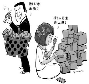 近日,各地刮起一阵“LV盲盒”风,一个LV包装风格的盒子,随机装有发卡、钥匙扣等物品,价格在88元至168元不等。这令不少消费者心动,有人一买就是十盒。其实LV盲盒并非官方出品,而是卖家号称从真LV包上拆皮子,自配五金,手工制成小物品。借着名牌效应,变花样造假,这样做涉嫌违法。有这个手艺,为什么不做自己的东西而去蹭名牌呢?