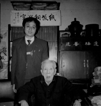与郑老交谈了约半小时,忽进来一位中年人,应是郑老家的常客,他说是南社费公直的外孙,在铁路部门工作,找郑老有事。怕影响来客与郑老的交谈,我便起身告辞,将那瓶“参龙长寿酒”送给郑老,祝他老人家健康长寿。我从书包里取出相机,请费公直的外孙摄影。在向往已久的纸帐铜瓶室,我站在郑老的藤椅后,定格下与郑老的珍贵留真……