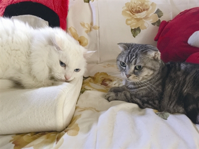 把妞妞抱回家的时候,她已经饿了一天一晚,到家后即刻大吃大喝起来。波波看到她,还是保持着那副“凛然不可亲近”的“高冷”范儿,并没有特别亲近,也许在他心里,妹妹不过是跑出去转了一圈又回来了而已,一切都没有变化,自己依然可以偶尔欺负欺负她,“猫生”不过如此。