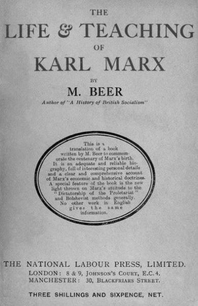 1930年,上海社会科学研究会推出了德国史学家贝尔(Max Beer,1864—1943)所著的《马克思传及其学说》(易桢译)。该书根据T. C. Partington和H. J. Stenning的英译本转译,全书分为绪论、父母与朋友、马克思主义的形成时代、狂风暴雨的年代与命运的变迁、马克思主义体系、结论等六部分。该书以简练的篇幅对马克思主义的形成、发展和体系作了勾勒,对马克思主义在中国的传播起了积极的推动作用。但受篇幅所限,贝尔对马克思的社会活动背景、革命实践、生活圈子、情感世界却很少提及。从严格意义上说,它还不是一部完整的马克思全传。