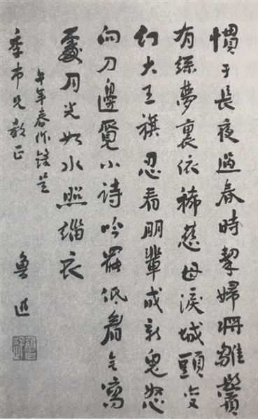 如果我们将鲁迅先生与郭沫若先生的手稿书法进行比较,也是颇有意思的。郭沫若先生的手稿书法作品,往往给人以纵横张扬与秀媚诗性的情感与思维美感,仿佛缺乏鲁迅先生的沉稳大度,果决坚强的蕴含力量。郭沫若先生的手稿书法是诗人的性格,浪漫而洒脱。鲁迅先生的手稿书法,是文人的品格,浑厚而蕴情。鲁迅喜爱魏晋碑文并研究魏晋文学。魏晋碑的字是用刀刻出来,刚劲雄健。后来的书帖是用毛笔写出来的,柔软善变。鲁迅先生手稿书法与文风,乃至为人处世的风骨皆显示魏晋时代的精神风采!鲁迅先生的手稿书法点画清爽,锋藏意涵;郭沫若先生的手稿书法多弧引带,舒张纵横。纵观鲁迅先生与郭沫若先生的手稿书法,亦可知他们的文章风采与为人处世的品格!