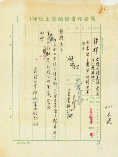 在车上,我找出那份与钱穆有关的文稿。文稿被别在一起共六页。第一页是商务印书馆编审出版部收发文的批审单,因被书估踩在脚下,脚印深深地印在了上边,后来经过装裱师的处理才弄掉。批审单第一栏受文者写:钱穆 香港九龙嘉林边道二十八号B地下。事由栏写:《先秦诸子系年》版权退还作者。发文日期栏写:1955年5月26日。拟办栏后附给钱穆的回信草稿: