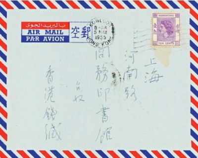 信封为空邮,贴香港一角邮票。收信地址为:上海河南路商务印书馆。此地址为原商馆地址。