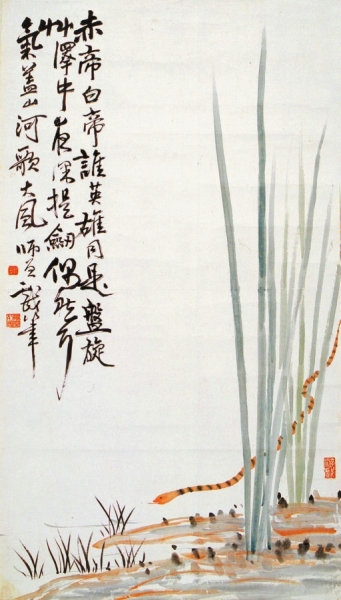 我得到陈师曾先生的画作,是我与友人徐先生交换到陈寅恪先生的那件诗稿不久的事儿。那是陈师曾先生所绘的一幅国画,画幅不大,但却蕴含着汉高祖刘邦醉斩白蛇和刘邦创作的《大风歌》的故事。画面上的草泽之中有一条红蛇昂首向前,有所向披靡之势,笔简意饶,形态逼真,颇有意境,耐人寻味,显露出典型的陈氏的水墨画风格。画面配诗一首,曰:“赤帝白帝谁英雄,同是盘旋草泽中。夜深提剑偶然行,气盖山河歌大风。”虽然落款书“师曾戏笔”并钤有一“游戏”之印,但我们可从其题材的选择中看到他独特的笔墨趣味,与他对现实的思考,并对其所谓“文人画”更有了深切认识。