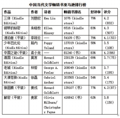 平装书方面,英文原创占据比翻译作品更多的优势:李翊云的《漂泊者》独占鳌头,紧随其后的是裘小龙的《中国之谜》。中国文学畅销书百强里,没有其他平装书籍入选。作者搜索了国内广受褒扬的《狼图腾》和《解密》,均只在平装书整体排行50万强以内而已。KindleStore方面,翻译作品整体表现不俗,并未在榜单上显示出相较于英文原创的劣势。《三体》一枝独秀、成绩斐然。出版发行不到10年就位居榜单第一位,超过了古代经典作品《道德经》和《论语》,在亚马逊kindlestore的全部图书排名中列居第1000多位,好评率79%,总评4.2分。另外一部进入“千强”的作品是朱晓枚的《钢琴的秘密:从劳改到巴赫戈德堡变奏曲》,好评率高达83%,总评4.3分。在KindleStore里表现不俗的还有《少年巴比伦》《酒国》《老城》《大漠苍狼》等。