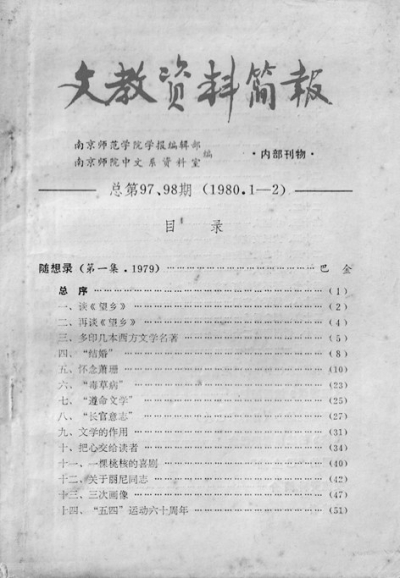 当年,大学逐渐开始恢复教学秩序,第一批工农兵学员刚走进学校。而面临文科图书资料严重缺乏的现状,南京师范学院中文系资料室的几位老教师心急如焚,开始收集资料,并准备用毛笔抄写后张贴出来,供师生们阅读。刚要抄写时,有教师提出,这不便阅读,也不利保存,建议改为纸张印刷。于是,他们改弦更张,弄来钢板、蜡纸,自己手摇印刷,当年9月,试办出第一份《文教动态》小刊。想不到,每月一期的这份油印刊物,一共出了三期,每期只印几百份,却大受院内外读者的欢迎,还纷纷要求改为铅印,扩大发行。于是,在校领导的支持下,于当年12月正式创刊《文教动态简报》,又从第十六期起,更名为《文教资料简报》,由李一氓先生题写刊名。后来,茅盾先生也题写了刊名,可见两位前辈对此刊的支持和鼓励。到1986年,申请了国内统一刊号,由“内部刊物”改为公开发行,更名为《文教资料》(双月刊),定价0.80元。