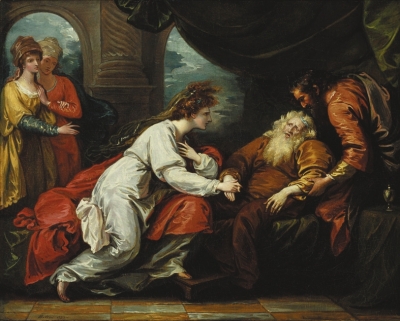 考狄利娅和李尔的感情是剧作《李尔王》所着重表现的。考狄利娅原是李尔最爱的女儿,但是因为她说了实话,使历来听惯奉承之言的李尔不悦,他便立即声称“永远和你断绝一切父女之情和血缘亲属的关系”。于是,她“只好自安于贫穷了”。但在李尔被两个姐姐榨得像“一个剥空了的豌豆荚”、沦落荒野并发疯时,她出于责任和名分,设法讨伐了这两个邪恶的女人,还前去看望她可怜的父亲。最初,李尔仍处在神智昏迷之中,随后一点点缓解过来,并意识到自己以前错待了这最有爱心的女儿,请她“不咎既往,宽赦我的过失”。父女俩的这次见面,以其强烈的人性光辉而令人动容。英属北美的艺术家本杰明·韦斯特(BenjaminWest,1738—1820)1793年创作的《李尔王和考狄利娅》(KingLearandCordelia)描绘的就是莎士比亚描写的这一场景:李尔靠在卧椅内,侍从按照考狄利娅的吩咐“已经替他把新衣服穿上去了”。考狄利娅正上前要去吻他,“啊,我的亲爱的父亲!但愿我的嘴唇上有治愈疯狂的灵药,让这一吻抹去了我那两个姐姐加在你身上的无情的伤害吧!”
