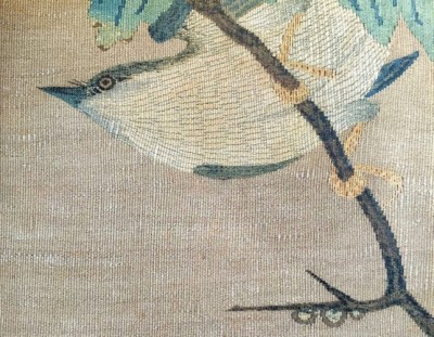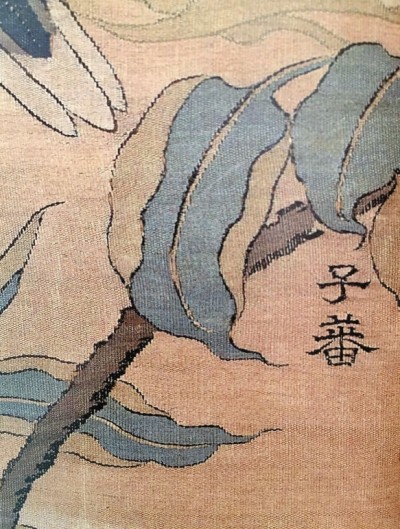 再说另一位缂丝大师沈子蕃,性别男,籍贯河北定州。靖康之后,42岁的他开始到南方收徒传艺,1165年去世,享年79岁。沈子蕃一生完成了几十件缂丝艺术品,有的未标作者,标有作者的只有五件,《梅鹊图》《青碧山水图》被北京故宫博物院收藏,另三件《缂丝山水图》《缂丝秋山诗意图》《缂丝桃花双鸟立图》在台北故宫博物院。
