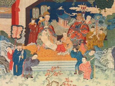 当年,乾隆皇帝就是为了庆祝母亲的六十大寿修建了清漪园——也就是今天颐和园的前身,而眼前这幅缂丝展现的就是他设想的天仙、罗汉、天王通通来祝寿的场面。“无量寿”的意思是“寿无量”,乾隆顺便也cosplay了一把,自己也入画,里面头戴斗笠、身穿红袍、双手合十的人,就是扮作罗汉的乾隆皇帝。