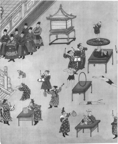 “旱船遥似泛,水儡近如生”(宋范成大《上元纪吴中节物俳谐体三十二韵》),说的就是我国古代的民间舞蹈跑旱船。至迟在唐代就已经有了山车旱船,“唐玄宗在东洛,大酺于五凤楼下,命三百里内县令刺史,率其声乐来赴阙……山车旱船、寻撞、走索、丸剑、角抵、戏马、斗鸡。……每正月望夜,又御勤政楼观作乐,贵臣戚里,官设看楼。夜阑,即遣宫女于楼前歌舞以娱之。”(宋李昉《太平广记》卷204引郑处诲《明皇杂录》)宋田况《儒林公议》记载:五代时前蜀皇帝王衍“侈荡无节,庭为山楼,以彩为之,作蓬莱山。画绿罗为水纹地衣,其间作水兽芰荷之类,作折红莲队。盛集锻者于山内鼓橐,以长籥引于地衣下,吹其水纹鼓荡,若波涛之起。复以杂彩为二舟,辘轳转动,自山门洞中出,载伎女二百二十人拨棹行舟,周游于地衣之上”。宋代山车旱船仍是闹元宵的重要活动,人们“夹道陆行,为竞渡之乐,谓之划旱船”。历史记载:宋太宗(雍熙元年十二月)丙申,“自丹凤楼至朱雀门张乐,迁四市货殖,五方士女大会,作山车旱船,往来御道,为鱼龙曼延之戏”(《太宗皇帝实录》卷31)。“看残大烛