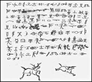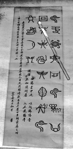如果仔细来看这些写得十分规矩的么些字,可以轻易地看出此时的和才已经在尝试把东巴象形文字升华到书法艺术的层面,也试图做些两个民族间文化交流的工作。他这种把么些文按汉人习惯来呈现新貌的写法,非常明显地是受了董作宾先生以甲骨文书写对联的影响。