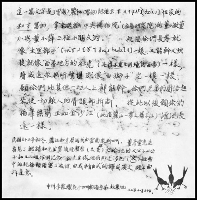 1947年元月,和才接丽江家信,因兄嫂去世,母病重无人照顾,必须返乡安顿。“中博”曾昭燏先生核准给假半年,和才于当月21日农历除夕,离沪飞昆明。临行前数日,和才向李霖灿展示一张四开大小石印的字帖,上面密密麻麻地写了一堆的以音标注释的象形文字与拼音文字,李先生立刻意识到和才要回乡去革东巴文字的命,他想要把东巴象形文字与哥巴拼音文字混乱没有标准的局面,一举统一。这可是秦始皇加李斯的工作,李先生很是为和才的决心而感动,但也善意地提醒和才,信心与成功之间不尽然是等号。因为这等于是把埃及象形文字一下子要跳跃到拉丁字母的工程,也等于是走一趟把甲骨文推进到注音符号的三千年岁月,真是谈何容易。