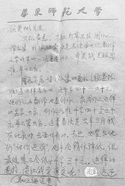 周氏家属对译文集的要求(稿费标准)是这样表示的,每千字四十—五十元,他们认为翻译也是创作,像周作人这样的名家、大家,创作标准千字四十至五十元并不算太多。这番看法是去年三月我在北京时当面听到的。当然与他们“讨价还价”,也许会稍作降低,但最低恐不会低于千字三十元。这样的要求,再加上编选费,贵社能否承受呢?而且,这还要看贵社计划出多大规模的译文集(即几卷本)?篇幅大小,也决定了如何编法,这一点也应从长计议的。