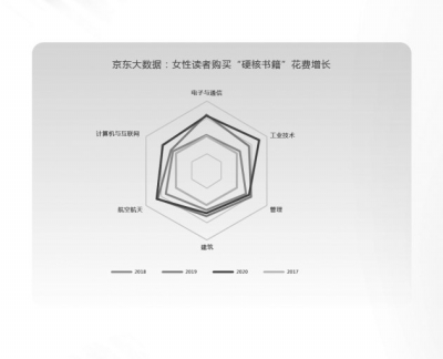 从四年的跨度来看,女性购买文学(包括青春文学)、外语、育儿类书籍的比例有所降低,与此同时,购买经济、金融、管理、原版书、法律、心理学等书籍的比例增长。甚至很多女性拿起各种“硬核”书籍,其中《labuladong的算法小抄》《液态火箭发动机推力室设计》《电工从入门到精通》《机器学习公式详解》等一般人连书名都看不懂的专业书,成为35岁以下女性在相关领域中的最畅销书籍。