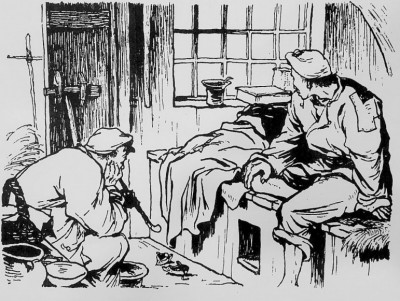 本是太阳当头的大白天,门插关儿竟把屋门给插上了,不只插上了,还又加上了个顶门棍,村里的那些嘻嘻哈哈的年轻人再也进不来了。这是谁的主意?很显然,是画家助了于福他爹一臂之力,大笔一挥,画了那个门插关儿。之所以如此者,“盖事有此势,人有此情”有如“孔融言武王以妲己赐周公,苏轼言舜(尧)三宥而皋陶三曰‘杀’”(《管锥编》)均属“想当然耳”也。